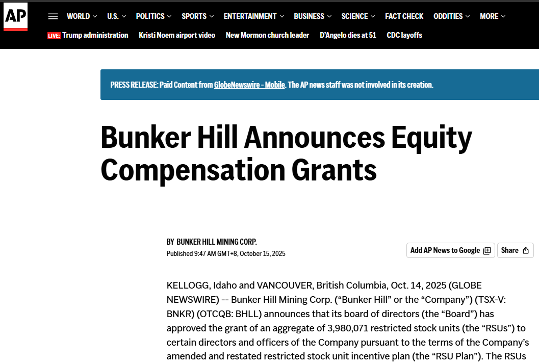 【全球网财经抽象报谈】据好意思联社音问,伯克希尔矿业公司(TSX-V: BNKR)(OTCQB: BHLL)10月14日晓谕,其董事会已批准一项大边界的股权激勉策划,向公司董事及高档解决层授予共计3,980,071份受限股票单元(RSUs)和626,593份股票期权。此举旨在激勉中枢团队,全力撑抓公司重启并建造其位于北好意思的旗舰矿产金钱。