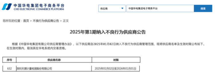 此外,公开信息还表露,中国华电集团电子商务平台在2025年2月8日发布《2025年第1期纳入不良手脚供应商公告》,将天溯计量纳入不良手脚供应商管理领域。