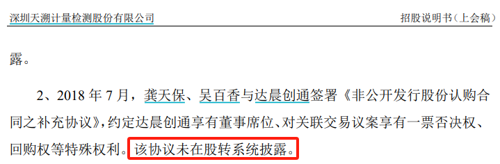 另据公开信息线路表露,天溯计量此前曾在股转系统挂牌,于2015年发布公开转让施展书并请求挂牌,后于2019年2月在请求远离挂牌。把柄本次请求IPO发布的招股书线路,在2018年7月,龚天保、吴百香与达晨创通签署《非公开拓行股份认购合同之补充公约》(以下简称“《认购合同补充公约》”),商定达晨创通享有董事席位、对干系交往议案享有一票否决权、回购权等稀薄权益,然则该公约未在股转系统线路。